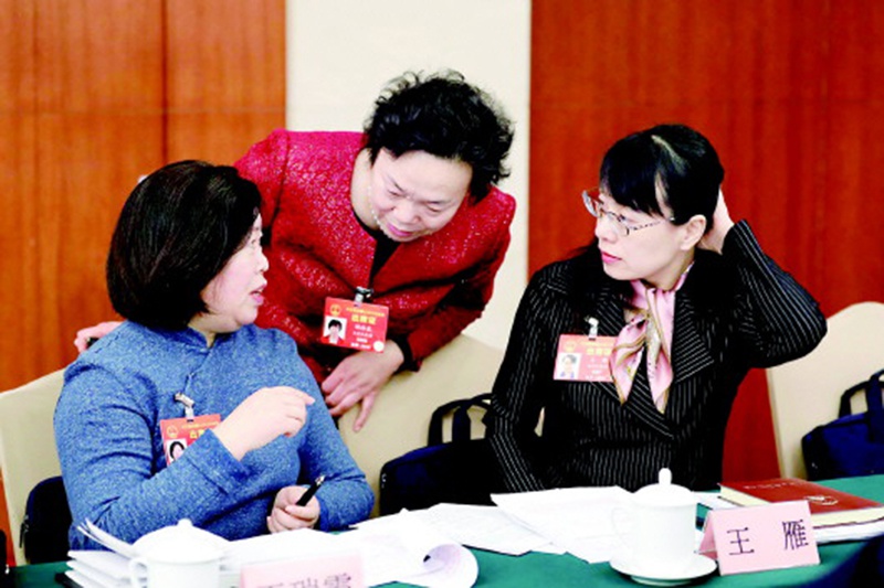 山東代表團代表胡桂花(中)、王瑞霞(左)、王雁,討論支持民營企業發展的政策舉措如何落地落實。(轉自《大眾日報》手機客戶端)