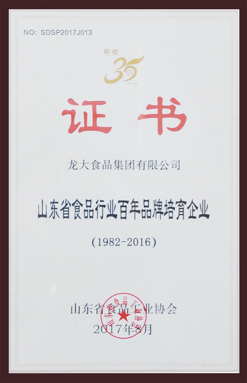 龍大榮獲“山東食品行業(yè)百年品牌培育企業(yè)”稱號